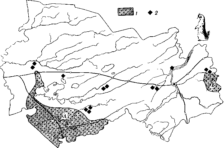 1—районы распространения: А — западная популяция (Кулунда, Бараба); Б — восточная, популяция (лесостепь предгорий Салаира); 2 — отдельные места находок.