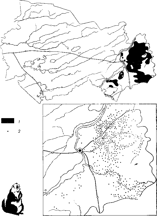 1 — районы распространения; 2 — размещение (каждая точка — 10 особей).