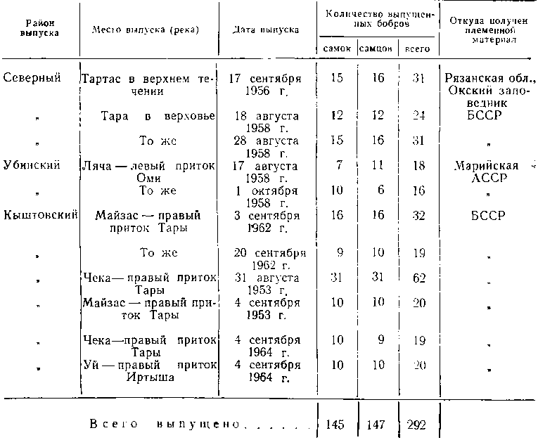 В 1965 г. мною совместно с С. А. Абашкиным обследованы места выпуска бобров в Северном и Кыштовском районах. Река Тара была осмотрена от верховий до с. Кыштовка, охвачены и ее правые притоки— Чека и Майзасс, а также неоколько небольших речек и ручьев, впадающих в Тару. Река Тартас была обследована от верховий до с. Северное. Ее правый приток — р. Тайдас —был обследован от устья почти до верховья.
