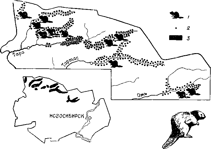 Места выпуска и размещения поселений бобра в Новосибирской области. 1 — места выпуска бобра; 2 — бобровые поселения (один кружок — одно поселение); 3 — районы размещения популяции бобров.