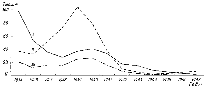 Наибольший падеж зайца наблюдался в 1940 г. От охотннков-корреопондентов из 36 районов Новосибирской области (в ее прежних границах) в 1940 г. было получено 110 указаний на случаи гибели зайцев. В этом же году, по сведениям Новосибирского облздравотдела, туляремия была зарегистрирована в 33 районах области. Показательно, что именно из этих, неблагополучных в отношении заболеваний, районов и поступили от охотников сведения о падеже беляка. Следовательно, только в трех районах из 36 гибель зайца не сопровождалась туляремией.
