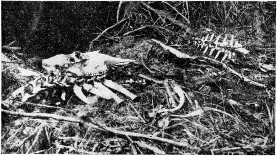 Остатки трупа лося, павшего в период эпизоотии (1958 г., окр. дер. Патюканово Северного района). Фото Л. А. Барбаша.
