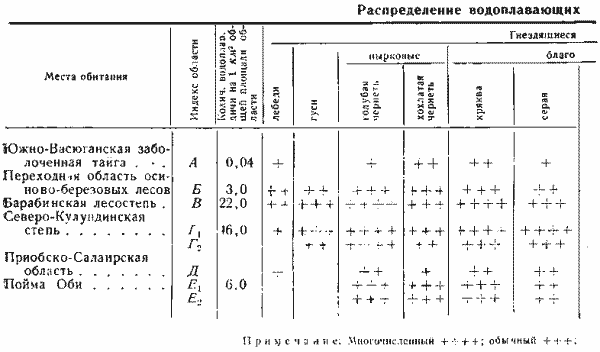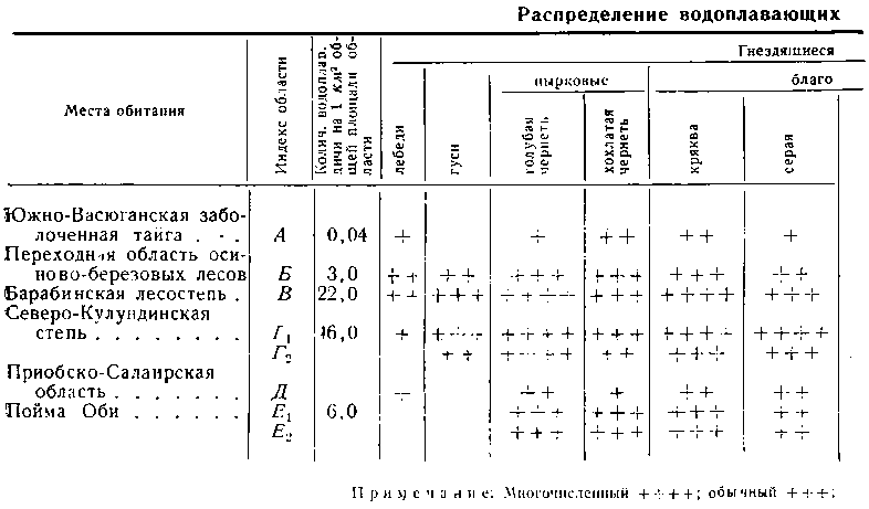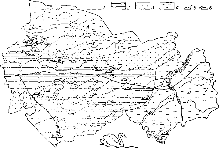 Области обитания водоплавающих птиц: 1— границы областей (А — Южно-Васюганская заболоченная тайга; Б — переходная область осиново-березовых лесов; В — Барабииская лесостепь; Г — Северо-Кулундинская степь; Г1 — с преобладанием пресных озер, Г2 — с преобладанием соленых озер, Д—приобско-салаирская область; Е — пойма Оби; E1 — северная, E2 - южная). Плотности населения водоплавающих (колич. птиц на 1 км2): 2 — высокая (свыше 10); 3 — средняя (от 1 до 10); 4— низкая (менее 1). Места гнездования: 5 — лебедя-кликуна; 6 — лебедя-шипуна.