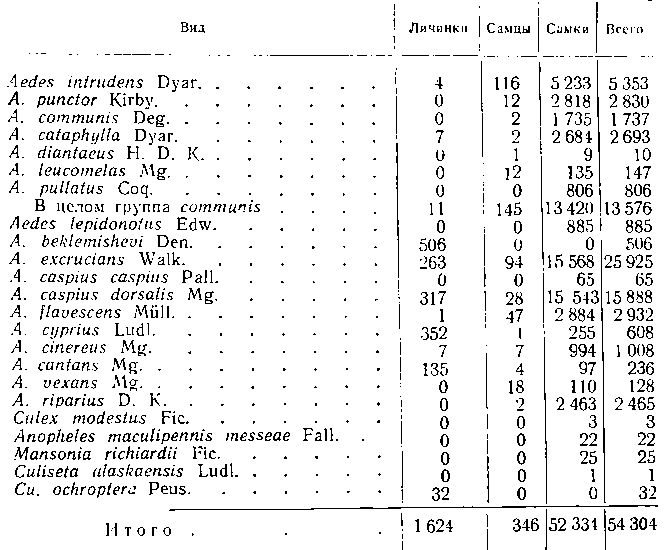 Основная масса комаров в 1961 г. (д. Горелая Грива Михайловского района) была представлена видами Aedes excrucians, A. lepidonotus и Aedes гр. communis, которые и определяют сезонный ход численности, так как со второй декады мая начался массовый лет Aedes lepidonotus, к которому через пятидневку присоединились комары Aedes группы communis. Эти виды и дали подъем численности комаров в мае. Присоединение к этим видам A. excrucians в первой декаде июня определяет максимальную численность комаров в сезоне. С третьей декады июня в популяции в основном преобладают комары вида A. excrucians.