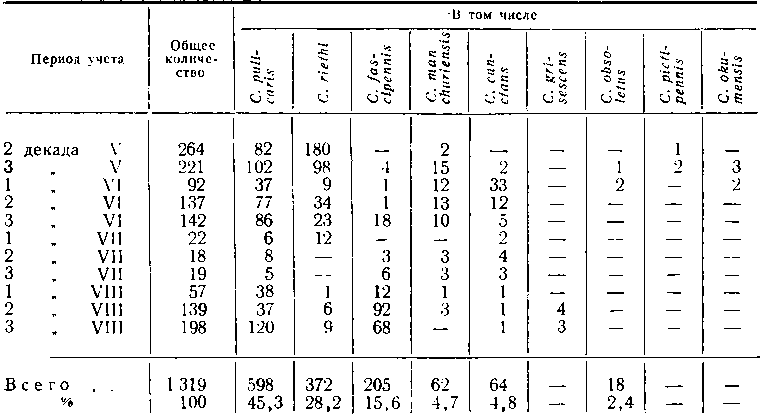 В 1959—1965 гг. нами обследованы различные районы Новосибирской области. В 1959 г. работы проводились в Маслянинсксм (с. Маслянино, деревни Дубровка и Нижняя Матренка), Ордынском (д. Новый Шарап) и Пихтовском (д. Королевка) районах; в 1960—1961 гг.— в Михайловском районе (д. Зоново); в 1962 г.— в Карасукском (с. Карасук) и Коченевском (д. Пятый кордон) районах; в 1964—1965 гг.— в окр. Новосибирска (Ботанический сад, Ельцовка, Каннская заимка, Издревая, Каменка). В сборе материала и наблюдении принимали участие сотрудники Биологического института СО АН СССР Ю. П. Коршунов,. Л. П. Кухарчук, С. И. Боброва.