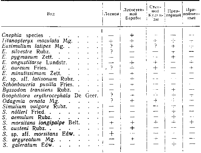 Из перечисленных 14 видов лишь четыре — Е. angustitarse Lundstr., Е. sp. aff. latipes Mg., E. minutissimum Zett. и S. vulgare Rubz. не нападают на животных и человека. Остальные— кровососы. Самые массовые из них — S. morsitans longipalpe Belt. и S. argyreatum Mg. из Оми. Изредка нападающие Т. maculata Mg. и Sch. pusilla Fries, залетают в Барабинскую лесостепь с Оби и Иртыша, но так как расстояние до их мест выплода огромно (достигает более 200 км), то и численность их здесь ничтожна. Так, в 1961 г. у с. Зоново на долю каждого из них приходилось лишь по 0,3% общего числа нападающих мошек.