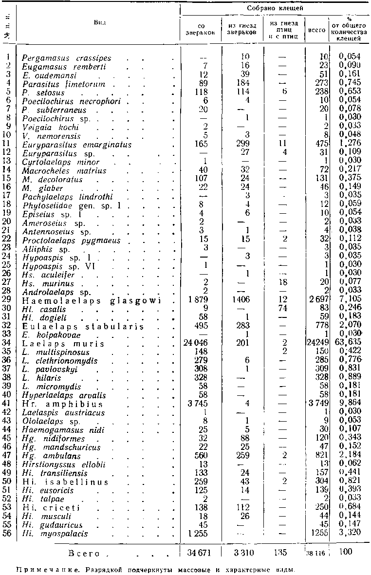 С другой стороны, уменьшение по сравнению с тайгой в отловах землероек, естественно, сказывается и на уменьшении в общем балансе клеща Hi. eusoricis. В лесостепи по сравнению с лесными ландшафтами повышается доля Hg. mandschuricus и Hg. nidiformes. Довольно многочисленны L. hilaris в основном на серых полевках и L. pavlovskyi на полевых мышах.