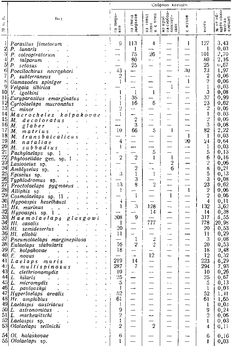 А. А. Земская (1962), изучавшая видовой состав гамазид на территории Северного Казахстана, непосредственно граничащей с районами наших работ, указывает для степи всего 35 видов. Однако среди них есть виды, не встреченные в наших сборах: Hs. heselhausi, L. algericus, L. agilis, O. silviarum. Hs. heselhausi — редкий, свободноживущий клещ с начальной стадией паразитизма. Он спорадически встречается на территории Западной Сибири во всех зонах. Отсутствие его в наших степных сборах случайно. О. silviarum — птичий клещ. Нами впервые для Западной Сибири отмечен в открытых гнездах воробьиных птиц в пойме Оби, а в сборах из степной зоны не встречен. Мы также считаем это случайным.