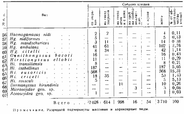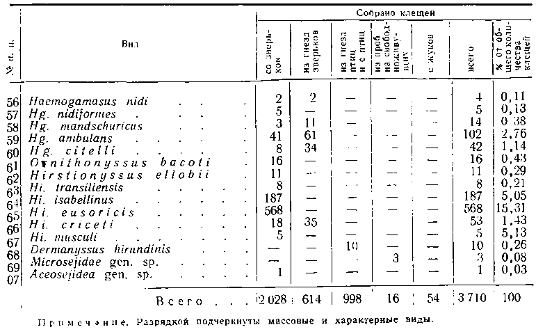 Как уже сообщалось, в годы наших исследований у фоновых для степи видов — узкочерепной полевки и краснощекого суслика — не наблюдалось высокой численности, в период которой можно уверенно ожидать увеличения в общем балансе гамазид процента HI glasgowi и Hg. nidiformes, весьма обычных на узкочерепных полевках, и Hi. criceti и Hg. citelli, связанных с краснощеким сусликом.