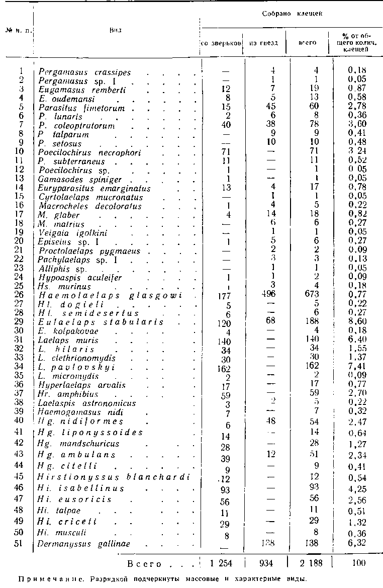 Видовой состав гамазовых клещей отличается необычайной разнородностью. Так примерно, в одинаковом проценте в сборах встречаются лесной Hg. liponyssoides и степной Hg. citelli, лесной HI. dogieli и степной HI. semidesertus. Только здесь и в предгорной тайге Салаира обнаружен специфический паразит алтайского сурка — Hi. blanchardi. Однако доминирующим видом здесь также оказался типично лесостепной HL glasgowi. Многочисленность в отловах мышей обусловила высокий процент L. pavlovskyi.