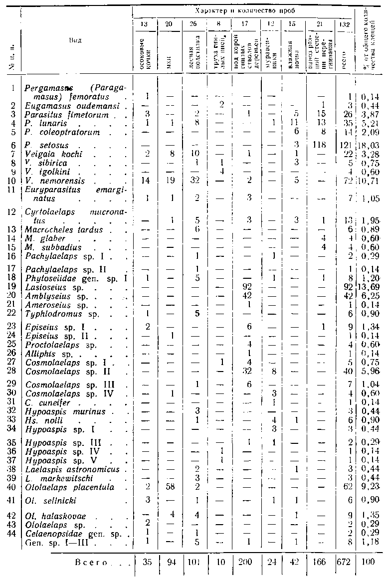 Фауна свободноживущих гамазид изучена достаточно тщательно только в подзоне березово-осиновых лесов (с. Алексеевка Кыштовского района). В остальных ландшафтах эти клещи получены попутно при обработке зверьков и их гнезд. Поэтому судить о фауне свободноживущих гамазид в разрезе ландшафтов пока нет возможности. Исследование проб различных субстратов выявило большое разнообразие населяющих их гамазид, только небольшая часть которых встречается в гнездах зверьков и на них самих.