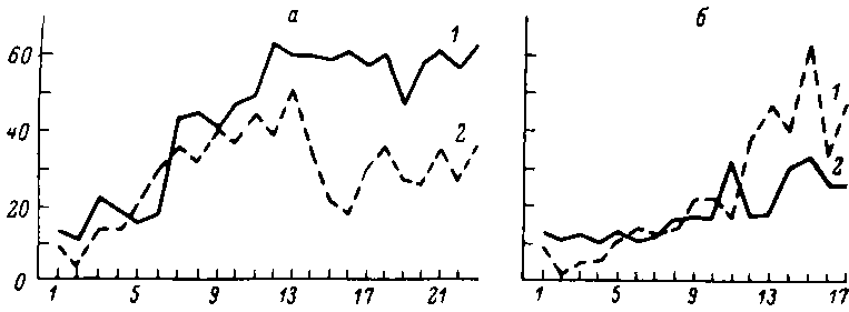 а — в первые дни вылупления, б — в последние дни вылупления; сплошная линия — проявление в первые дни, пунктирная — проявление в последние дни; по оси абсцисс — поколения отбора, на оси ординат — процент проявления безглазия (по: Камшилов, 1939а).