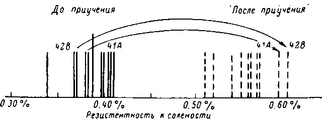 Первоначальная и приобретенная резистентность отдельных линий Parameicum caudatum к повышенной солености среды через месяц после начала их приучения (по: Смарагдова, Гаузе, 1939).