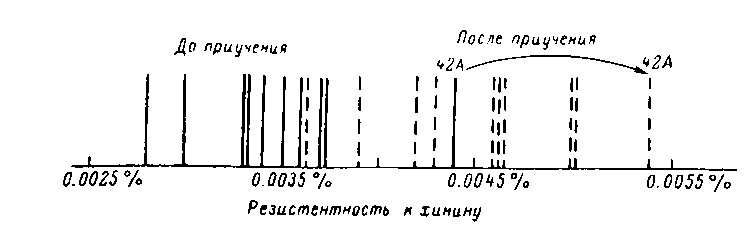 Первоначальная п приобретенная резистентность отдельных линий Paramecium caudatum к растворам хинина (по: Смарагдова, Гаузе, 1939).