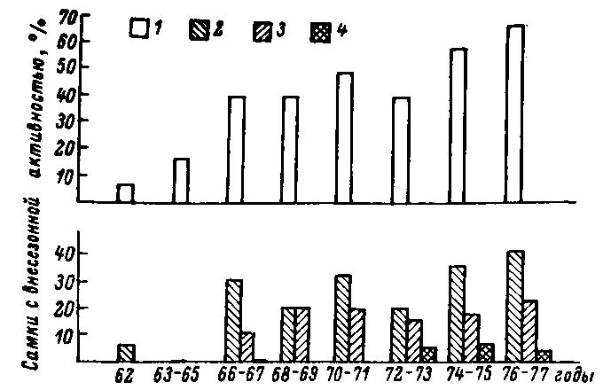 Динамика внесезонной астральной активности у ручных лисиц разных лет рождения.