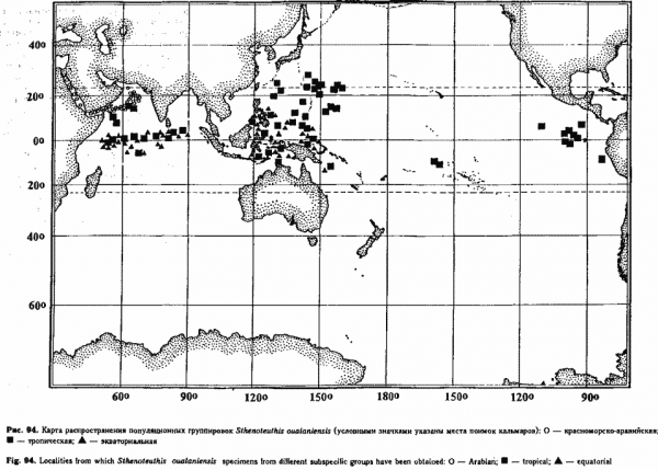 Материал. Проанализировано 330 кальмаров S. oualaniensis, пойманных на всем протяжении ареала этого вида — от Красного моря до побережья Центральной и Южной Америки. В материале были представлены кальмары обоих полов и всех стадий зрелости с длиной мантии от 0,8 до 61 см, в том числе 268 экземпляров из Индийского океана, 25 — из Западной Пацифики и 37 — из Восточной Пацифики. По группировкам материал разделился следующим образом. К мелкой группировке без спинного фотофора (скороспелой, по терминологии Несиса) отнесено 50 экземпляров, в том числе 27 самок и 23 самца. Из них 40 экземпляров было поймано в экваториальной части Индийского океана и 3 — в Западной Пацифике. К позднеспелой группировке со спинным фотофором принадлежало 280 кальмаров, в том числе 209 экземпляров из Аравийского и Красного морей, 12 экземпляров из Индийского
