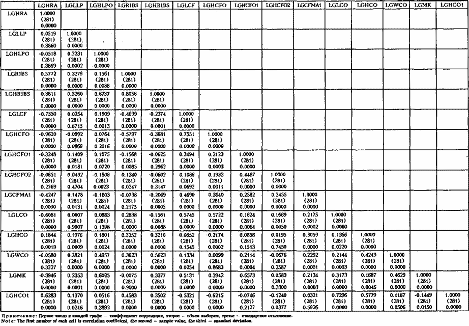Корреляционный анализ был сделан на первом этапе для определения взаимозависимости 14 пропорций. Его результаты представлены в таблице.