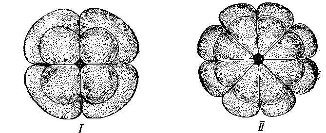 Схема радиального дробления. I— стадия восьми бластомеров; II — стадия шестнадцати бластомеров