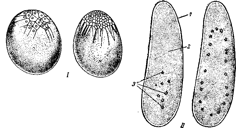 Неполное дробление. I — схема дискоидального дробления яйца головоногого моллюска; II — схема поверхностного дробления яйца насекомого: