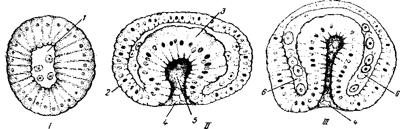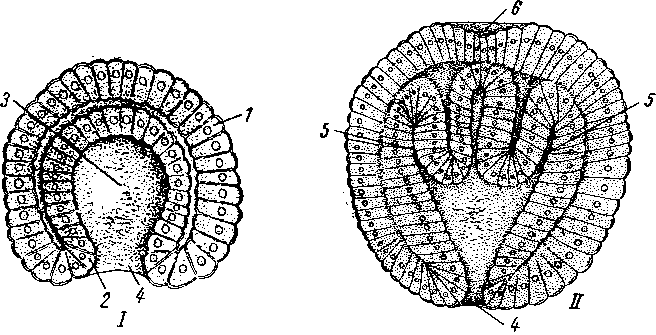1 — бластоцель, 2 — эктодерма, 3—энтодерма, 4 — бластопор, 5 — первичный кишечник, 6 — мезодермальные полоски