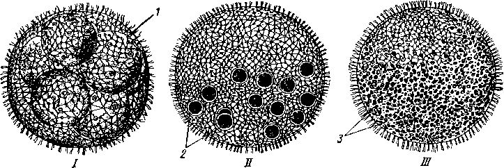 Volvox aureus. I — бесполая колония; II — женская колония; III —мужская колония: