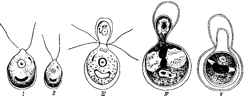 Анизогамная копуляция Chlamidomonas braunii. I —макрогамета: II микрогамета; III — V — копуляция