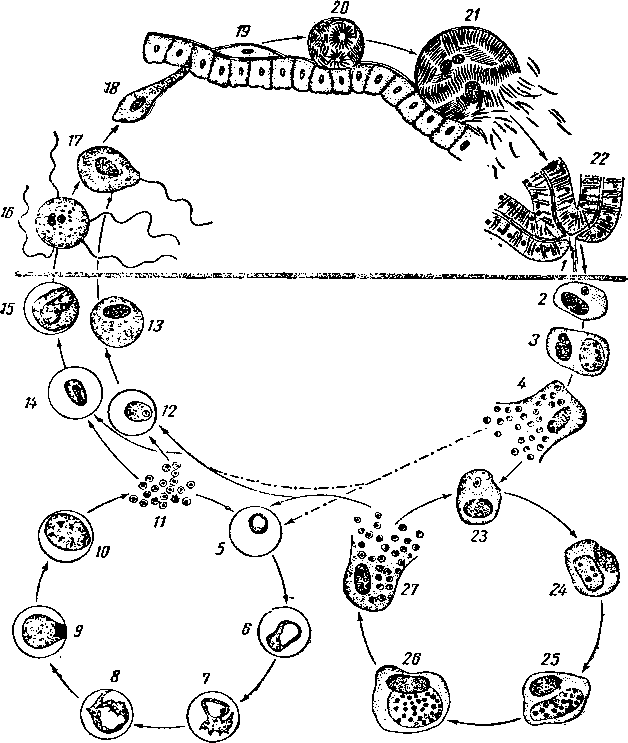 1— спорозоит, выходящий из протока слюнной железы, 2 — 4 — развитие спорозоита в тканевой клетке (экзоэритроцитарные стадии), 4 — образование тканевых мерозоитов, 5— 10—развитие паразитов в эритроцитах (эндоэритроцитарные стадии), II — шизогония, 12 и 13—развитие макрогаметоцита, 14 и 15 — развитие микрогаметоцита, 16 — образование микрогамет, 17 — проникновение микрогаметы в макрогамету (оплодотворение), 18 — проникновение оокинеты сквозь стенку средней кишки комара, 19 и 20 — развитие ооцисты на поверхности средней кишки комара, 21— разрыв зрелой ооцисты, выход спорозоитов, 22 — спорозоиты в слюнной железе комара, 23 — 27 — развитие последующих генераций паразита в тканевых клетках. Стадии 2—15 и 23—27—в человеке. Стадии 16 — 22—в комаре. I — 22 и пунктирные стрелки — цикл PI. falciparum, I — 27 и все сплошные дугообразные стрелки — цикл Pl. vivax