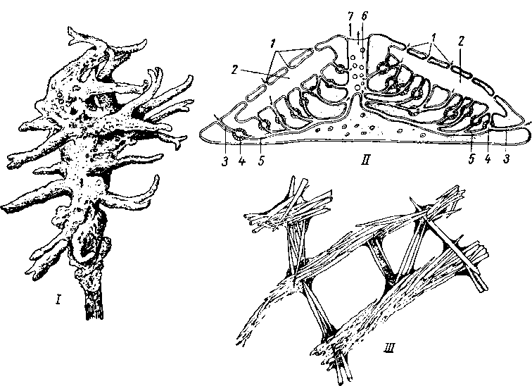 Бодяга (Spongilla). I — общий вид колонии; II — схема внутреннего строения; III — часть скелета: