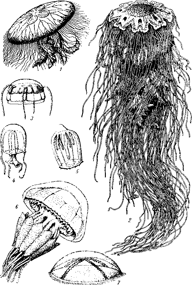 1 — Aurelia aurita (сцифомедуза) — встречается во всех морях, 2 — Cyanea arctica (сцифомедуза) — северные моря, 3—Aeginopsis (наркомедуза) — северные моря, 4 — Sarsia (антомедуза) — северные моря, 5 — Aglantha (трахимедуза) — северные моря, 6 — Rhizostoma pulmo (корнерот) — Черное море, 7, — Slaurophora (лептомедуза) — северные моря