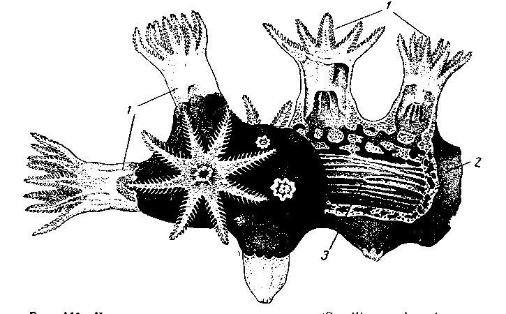 1 — полипы, два правых в разрезе, 2—ценосарк, « — скелетный стержень