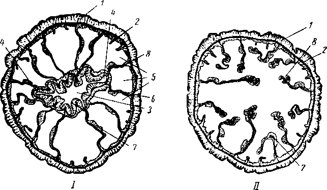 Поперечные разрезы Actinia equina. I — на уровне глотки; II — в нижней части тела: