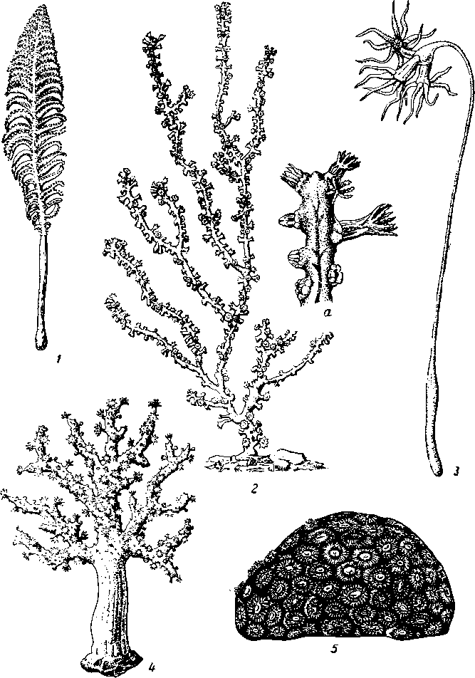 1 — морское перо Pennatula (восьмилучевые) — теплые моря, 2 — Gorgonaria (восьмилучевые) — теплые моря (а— часть колонии при большом увеличении), 3— Cmbelulla encrinus (восьмилучевые)— северная часть Карского моря, северная Атлантика, 4—Alcyonium (восьмилучевые) — теплые моря, 5 — Astrea (шестилучевые) — тропические моря