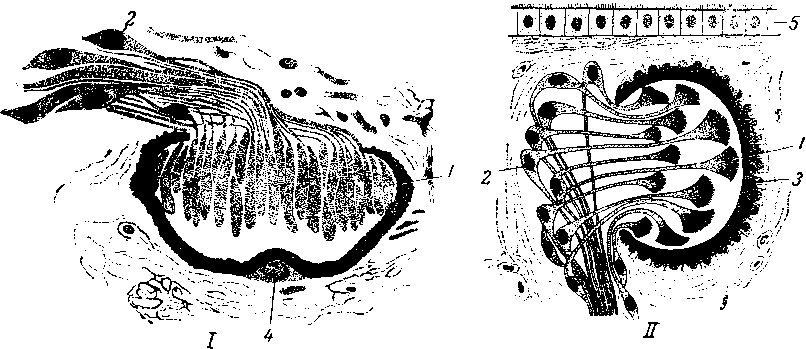 1 — зрительные колбы, 2 — зрительные клетки, расположенные вне пигментного бокала, 3—клетки зрительного бокала, 4 — ядро клетки зрительного бокала, 5 — эпителий кожи