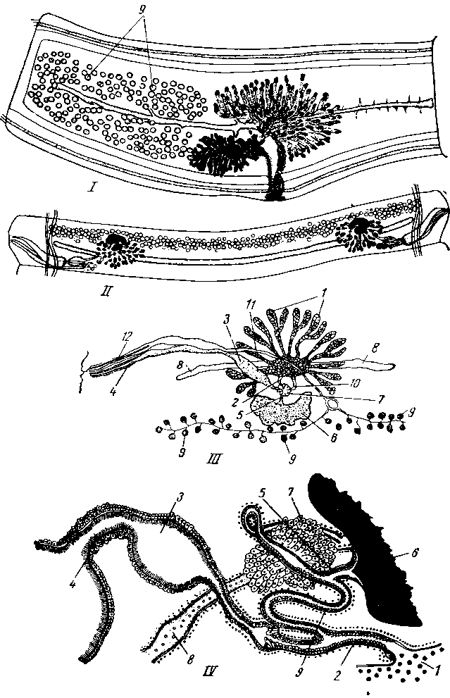 Половая система цестод. I — членик Catenotaenia dendritica; II — Moniezia planissima; III — Mosgovoyia pectinata; IV — Bertiella elongata. Строение половой системы, а в частности и отношение оотипа к другим половым органам, особенно явственны у Mosgovoyia:
