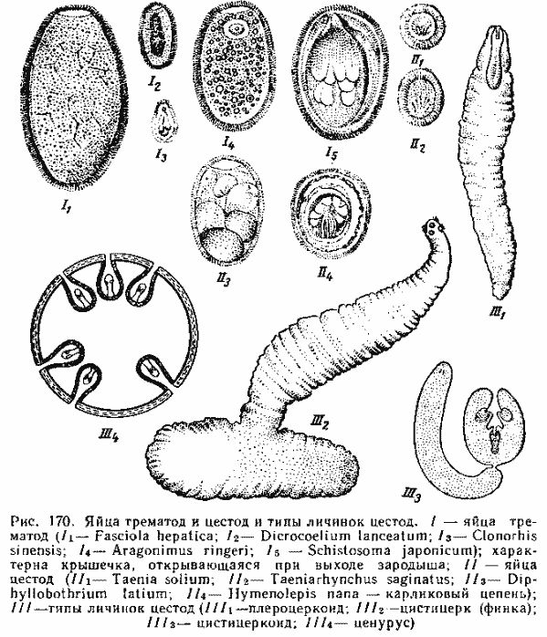 Размножение и развитие (онтогенез). Оплодотворение у цестод достигается в результате совокупления, причем циррус выпячивается наружу и вводится в отверстие вагины. Если в кишечнике имеется несколько особей, то может иметь место перекрестное оплодотворение. Однако, если в кишечнике находится лишь одна особь, то наблюдается копуляция между члениками одной и той же особи или даже самооплодотворение данного членика. Оплодотворение яиц происходит в семеприемнике, а формирование зародыша — в оотипе. Дробление яиц происходит либо в матке, либо во внешней среде. Характер дробления своеобразный. Он носит незакономерный характер и приводит к развитию морулоподобной клеточной массы, которая вслед за тем дифференцируется на эктодермическую эмбриональную и внутреннюю оболочку, у некоторых форм покрытую ресничками, у других — имеющую хитиноподобную консистенцию и радиально исчерченную структуру. В результате дробления формируется зародыш, вооруженный крючьями. Последних либо 6 — тогда это онкосфера, либо 10 — тогда зародыш называется ликофорон. Матка зрелых члеников набита соответственно онкосферами или ликофорами.