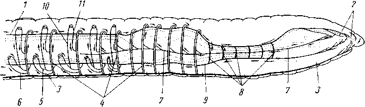 1 — спинной сосуд, 2 — капилляры головы, 3—невральные сосуды (для простоты показан один); 4 — париетальные сосуды, 5 — входящий сосуд мстансфридия, 6 — его выносящий сосуд, 7 — латеральный сосуд, 8 — «сердце», 9 — брюшной сосуд, 10 — входящий кожный сосуд, 11 — выносящий кожный сосуд. Схема упрощена — метанефридиальные и кожные сосуды показаны лишь частично, чтобы оставались ясными отношения латеральных сосудов и т. п. Стрелки показывают направление кровяного тока, кишечная трубка показана пунктиром