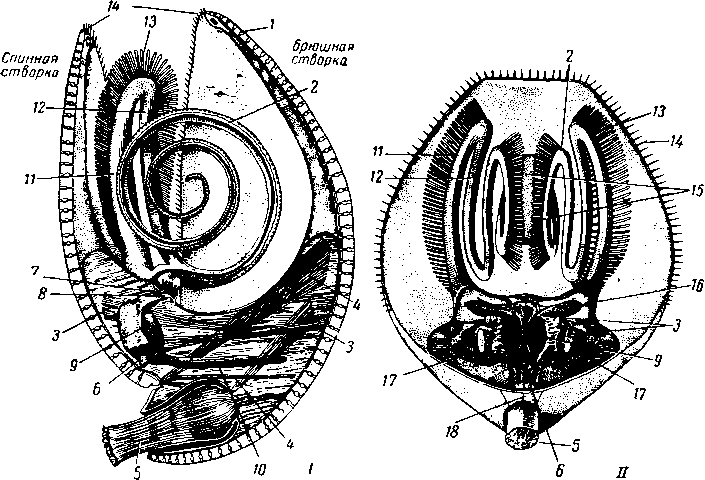1 — сосочки мантии, входящие в канальцы раковины, 2 — спирально завитой участок руки, 3—мышцы замыкателя раковины, 4— мышцы, раскрывающие раковину, 5 — стебелек, 6— сердце, 7 — рот, 8 — пищевод, 9 — желудок, 10— замкнутая кишка, 11 и 12 — прямые участки рук, 13—цирры рук, 14 — щетинки по краю мантии. 15 — перепонка, соединяющая руки, 16 — печень, 17 — органы выделения (целомодукты), 18 — дельтидиальные пластинки