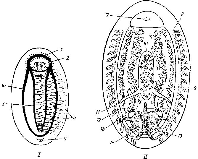 1 — окологлоточное нервное кольцо, 2— радулярные ганглии, 3— ножные нервные стволы, 4— туловищные нервные тяжи, 5 — жабры (ктенидии), 6 — анальное отверстие, 7—рот, 8 — жаберная вена, 9 — почки, 10— половая железа, 11 — протоки половой железы, 12— наружное отверстие почки, 13 — перикардиальная полость, 14 — сердце, 15 — реноперикардиальное отверстие
