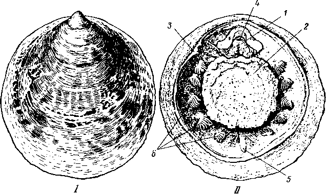 1 — передний отдел, 2 — нога, 3 — мантия, 4 — рот, 5 — анальное отверстие, 6 — жабры (по Лемхе)