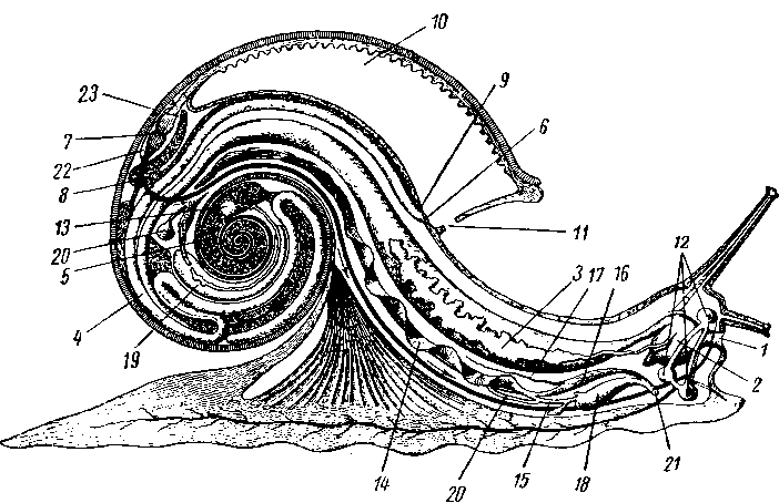 1 - рот, 2 — глотка, 3 — слюнные железы, 4 — кишечник, 5 — печень, 6 — анальное отверстие, 7 — сердце, 8 — почка, 9 — наружное отверстие почки, 10—легкое, 11 — дыхательное отверстие, 12 — окологлоточные ганглии, 13—гермафродитная железа, 14 — семя-яйцепровод, 15 — яйцевод, 16—семяпровод, 17 — жгут (флаггелум), 18 — мешок «любовных стрел», 19 — белковая железа, 20 — проток и резервуар семеприемника (пальчатые железы не изображены), 21 — половое отверстие, 22 — перикардиальная полость, 23—реноперикардинальное отверстие. Стрелками показано направление движения крови