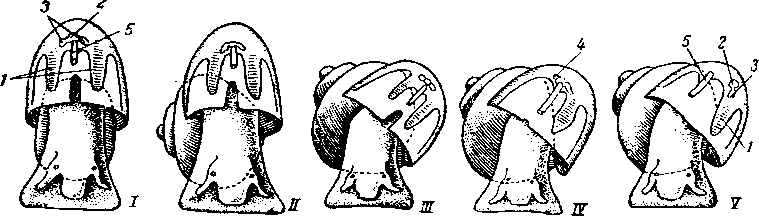 Образование асимметрии раковины и мантийного комплекса (схема). I — V — ряд последовательных гипотетических стадий: