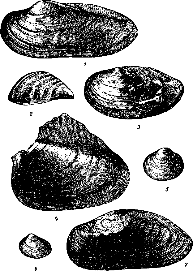 1 — перловица (Unio pictorum), 2— дрейссена (Dreissena polymorpha), 3 — беззубка (Anodonta cygnea), 4 — Cristaria plicata — водоемы Дальнего Востока, 7— шаровка (Sphaerium corneum), 6—горошинка (Pisidium amnicum), 7 —речная жемчужница (Margaritana margaritifera) — водоемы севера европейской части СССР