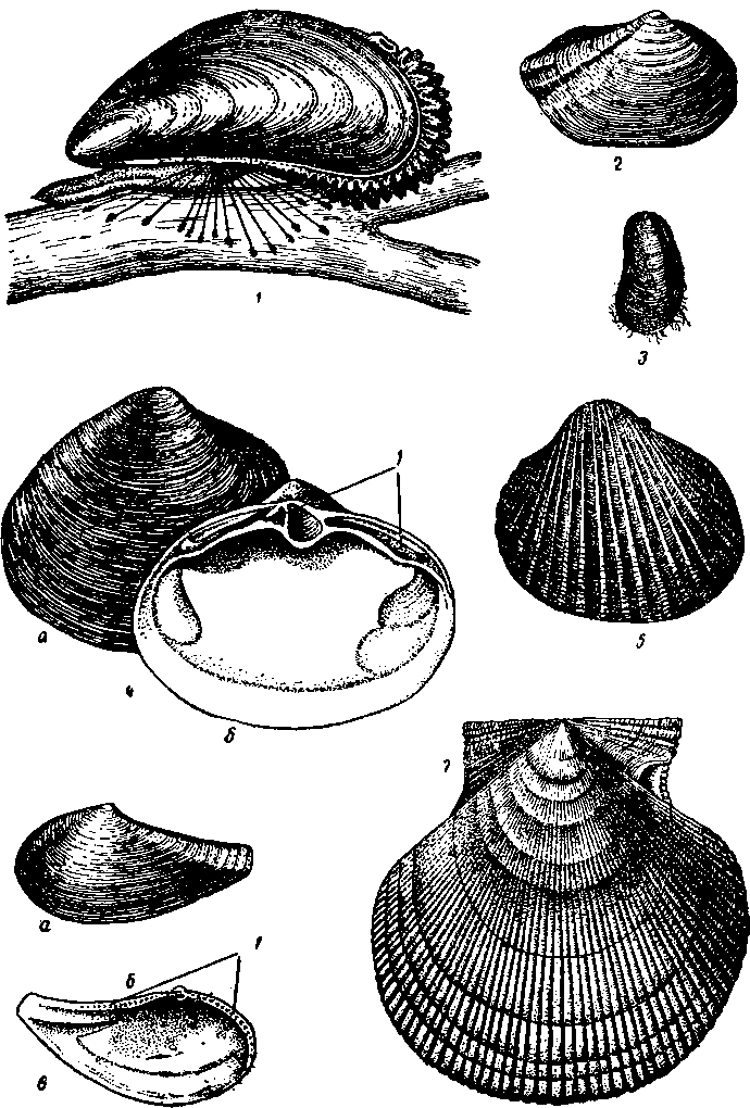 1 — мидия (Mvtiius edulis) — северные мори, 2— Portlandia arctica — северные моря, 3 — фазеолина (Modiola phaseolina) — Черное море, 4 — белая ракушка (Spisula sachalinensis) — Японское море (а — снаружи, б — с внутренней стороны; 1 — замок гетеродонтный), 5 — сердцевидка (Cardium edule)—Черное море, Балтийское, Каспийское и Аральское моря, Мурманское побережье, С — Leda pernula — северные моря (а — снаружи, б—с внутренней стороны; 1 — замок таксодонтный), 7, — гребешок (Pecten islandica) — северные моря