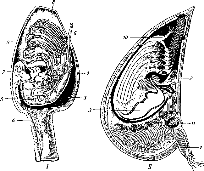 Морская уточка (Lepas) со вскрытой раковиной, сбоку. I — взрослая стадия; II — циприсовидная личинка: