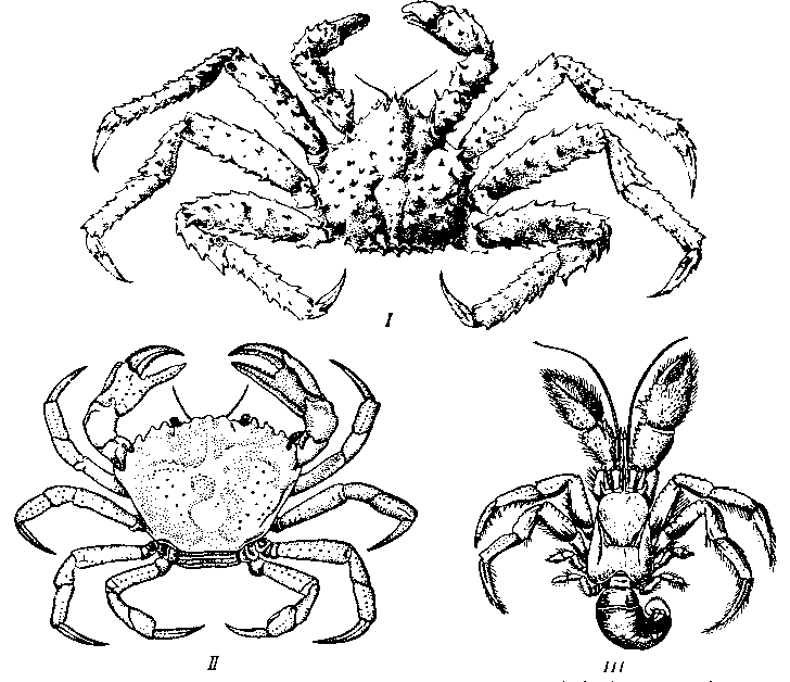 Ракообразные. I — Камчатский краб (Paralithodes camtschatica), уменьшено в 15 раз, II — прибрежный травяной краб (Carcinus maenas); III —рак-отшельник (Pagurus setosus)