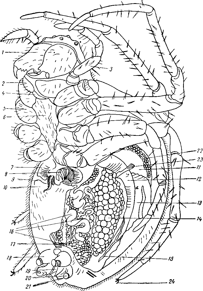 / —хелицера, 2 челюсть ногощупальца, 3—ногощупальце, 4— нижняя губа, 5—тазик второй пары ножек, 6—грудина, 7— щиток, прикрывающий легкое, 8— вскрытое листовидное легкое, 9 — стигма легкого, 10—половой вырост самки, 11 — печень, 12—средняя кишка, 13 — сердце, 14 — яичник, 15 — мальпигиева трубочка, 16 — паутинные железы, 17 — трахеи, 18 — передняя паутинная бородавка, 19—медиальная паутинная бородавка, 20—задняя паутинная бородавка, 21 — анальное отверстие, 22— срез через стенку тела, 23— дорзо-вентральная мышца, 24 — коготки