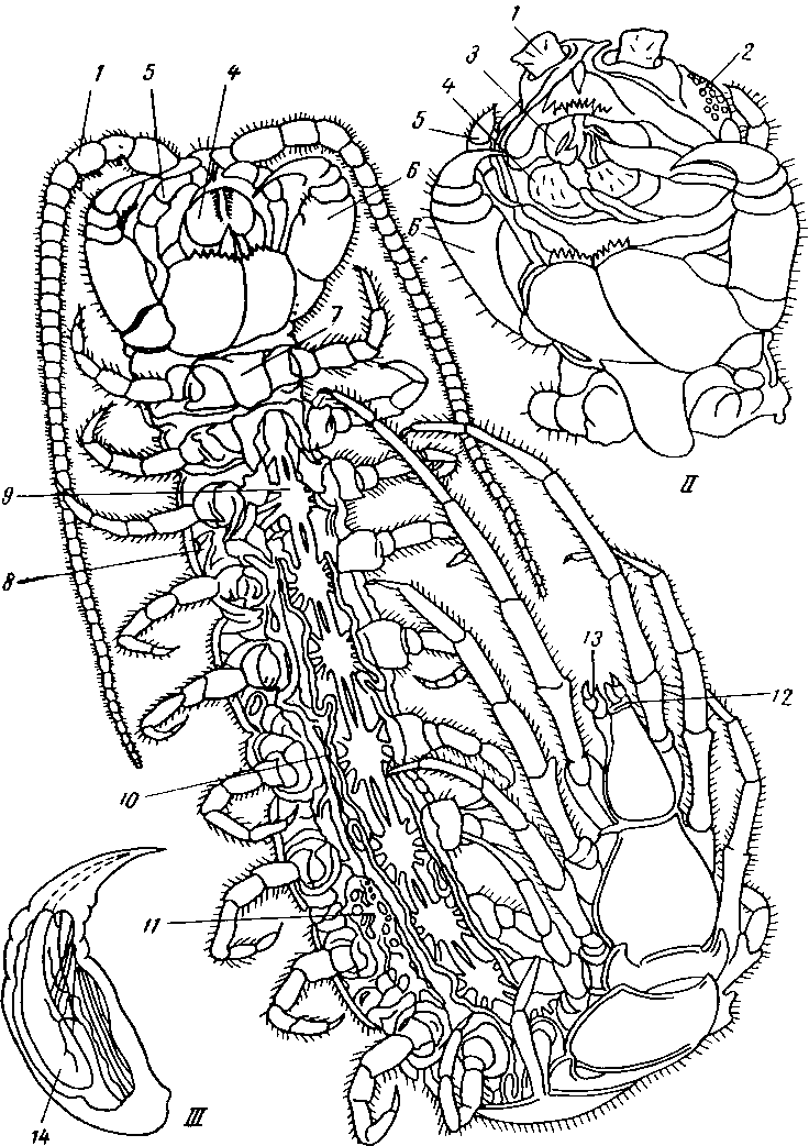 1— усик, 2— глаз, 3— верхняя челюсть, 4 — нижняя челюсть первой пары, 5 — нижняя челюсть второй пары (ее щупальце), 6 — ногочелюсть, 7— грудная пластинка, 8 — стигма, 9—нервная цепочка, 10—мальпигиева трубочка, 11 — яичник, 12—анальное отверстие, 13—половые ножки, 14— ядовитая железа