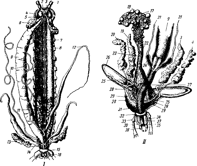 1— усик (обрезан), 2 — передний край головы, 2—надглоiочный узел, 4— ядоносная ногочелюсть, 5 — пищевод, 6—слюнная железа, 7 — брюшная нервная цепочка, 8— основание ножки, 9—средняя кишка, 10—мальпигиевы трубки, 11 — большая придаточная половая железа, 12 — семенник, 13 — малая придаточная половая железа, 14 — семяпроток, 15—спинной щиток, 16—наружные половые придатки, 17 — яичник, 18—яйцеклетка, 19 и 20 — придаточные железы, 21—мальпигиева трубочка, 22—граница яичника и яйцевода, 23—яйцевод, 24—вздутие мальпигиевой трубочки, 25 — расширение яйцевода, 26 — семеприемник, 27 — ветви яйцевода, охватывающие прямую кишку, 28 — протоки придаточных половых желез, 29—резервуар придаточной железы, 30— кроющий щиток, 31 — прямая кишка, 32—части последнего сегмента тела, 33—задняя ножка, 34 — щиток, отделяющий половой сегмент от анального, 35 — анальное отверстие, 36—наружные половые придатки, 37—спинка анального сегмента