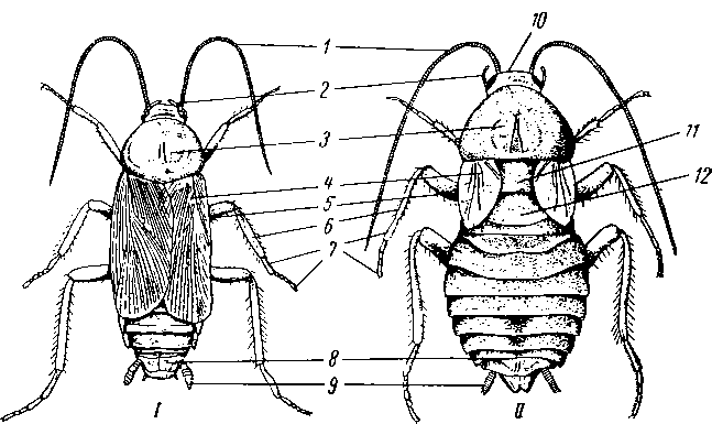 Внешнее строение. По расчленениютела на отделы черный таракан—типичное насекомое. Голова у него шейным перехватом ясно обособлена от туловища. Грудной отдел туловища слагается из трех сегментов, именуемых передне-, средне-, и заднегрудью (pro-, meso- и metathorax), которые несут по паре ножек. Средне- и заднегрудь, кроме того, несут у взрослого самца по паре хорошо развитых крыльев, у взрослой же самки на их месте лишь рудименты крыльев. Задний отдел туловища, десятичленистое брюшко, несет лишь одну пару развитых конечностей, церки (cerci), расположенных на заднем конце тела по сторонам анального отверстия.