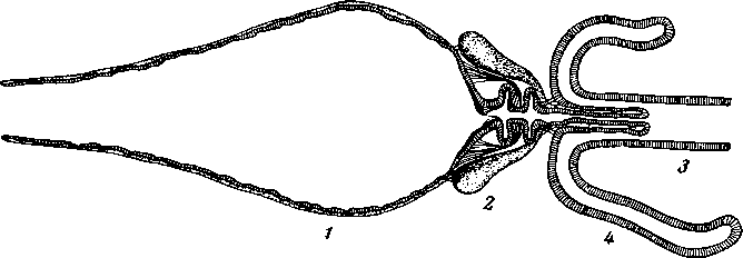 1— зоб, 2— мускулистый желудок, 3 — средняя кишка, 4 — слепая кишка